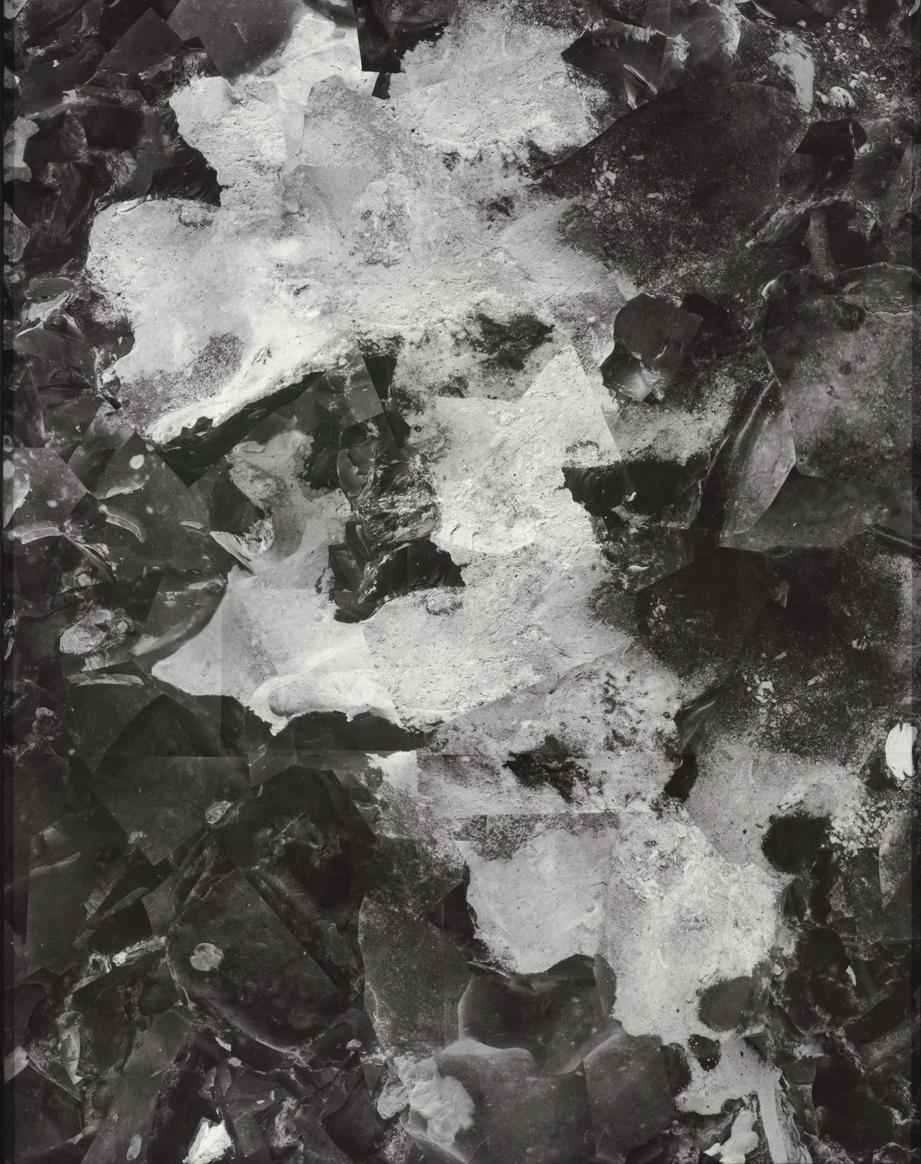 Splitting Distance features a series of photographic collages that transmit icy surfaces, tumultuous waters, rocky shores, and portals. This flint originated from the shores of France or the United Kingdom and is now found in Glace Bay, whose namesake was coined by French settlers, who named the location “Baie de Glace” (Bay of Ice). The chalky surface of the flint gives way to semi-translucent surfaces with reflective flecks and shards, similar to the textures and patterns found in ice and light bouncing off of water.