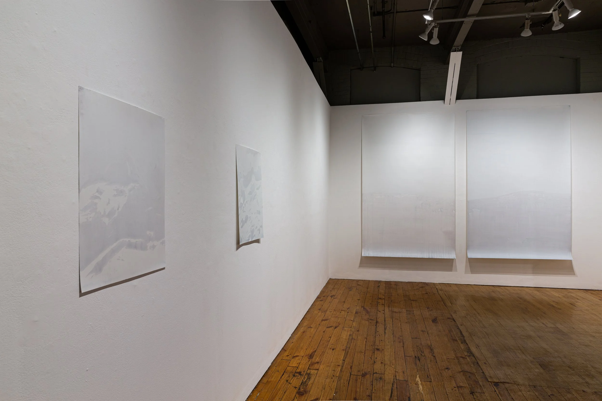 These drawings respond to an experience of a landscape that is made ambiguous on account of atmospheric and light conditions. Through making these drawings, I attempt to pull these snowy patches closer for inspection through hazy scrims hanging on the surface of each drawing.